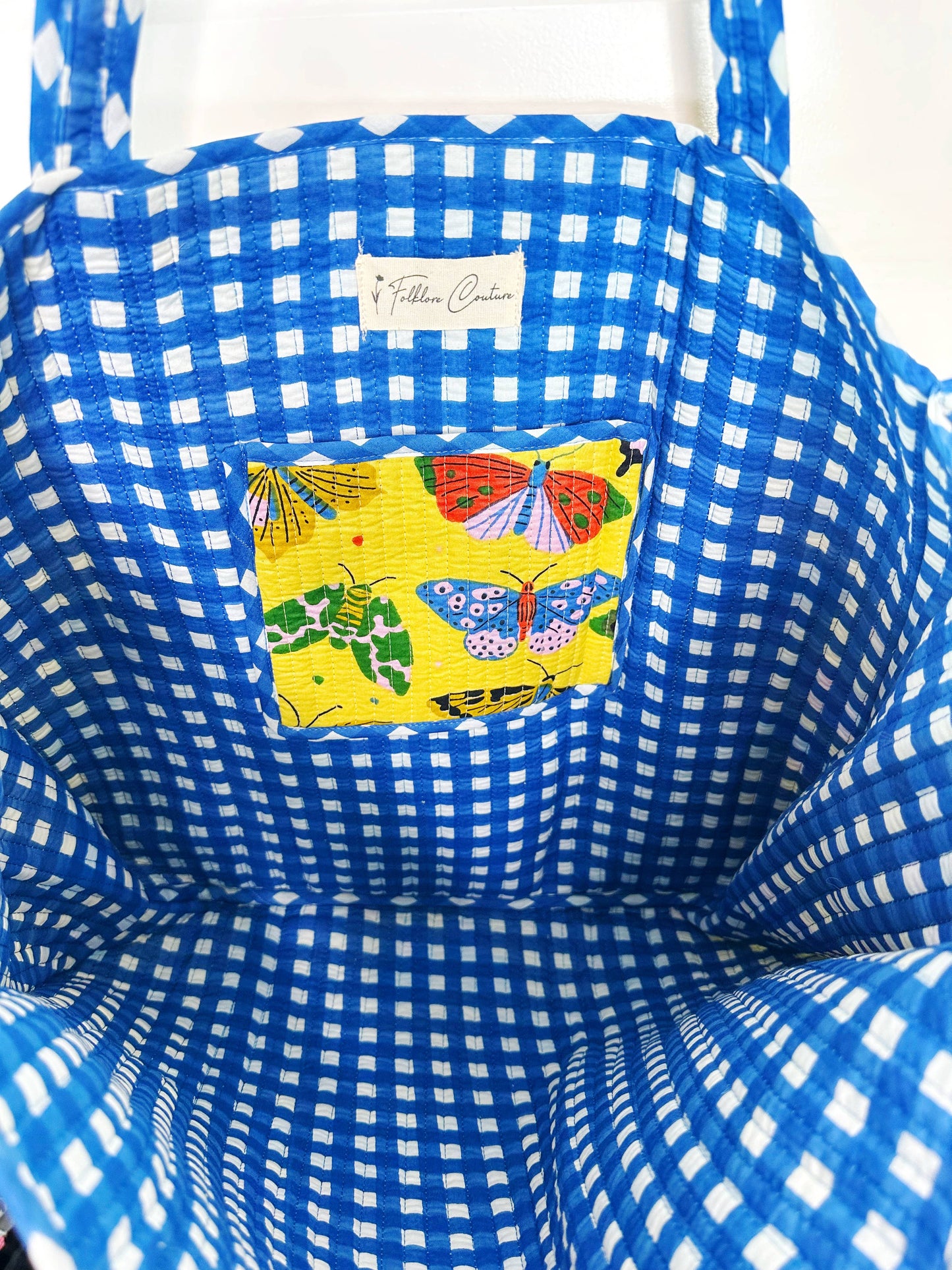 Yellow Butterfly Print Oversized Quilted Tote Bag - Reversible tote with contrasting interior - Interior pocket - 17.5" x 17.5" - 100% Cotton - Quilted block print fabric Perfect for: market tote, beach tote bag, weekender bag, overnight bag, large shopping tote, travel bag & more! Our quilted pieces are handmade by Indian artisans. The cotton fabrics are handprinted and proudly sustainably made. With block printed fabrics, there may be some variations and print placement may vary by bag. Handmade in small batches, prints are limited.
